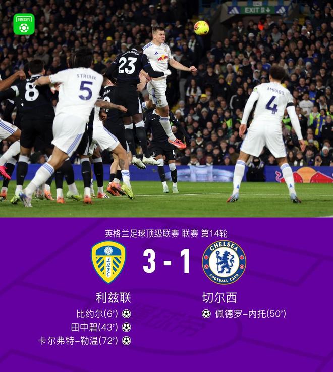 北京时间12月4日,英格兰足球超级联赛第14轮展开较量,利兹联坐镇主场迎战切尔西。上半场,比约尔闪击,田中碧轰世界波。下半场,内托替补登场为切尔西扳回一城,随后阿达拉比奥尤送大礼,卡尔弗特-勒温抓住机会破门。最终,切尔西1-3客负利兹联。