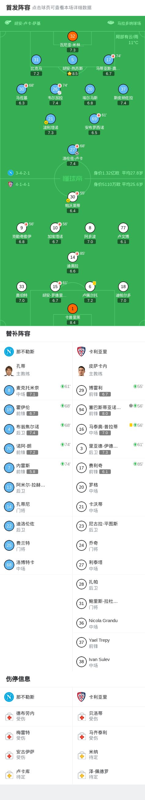 第28分钟,韦尔加拉传中,卢卡后点头球破门,那不勒斯1-0卡利亚里