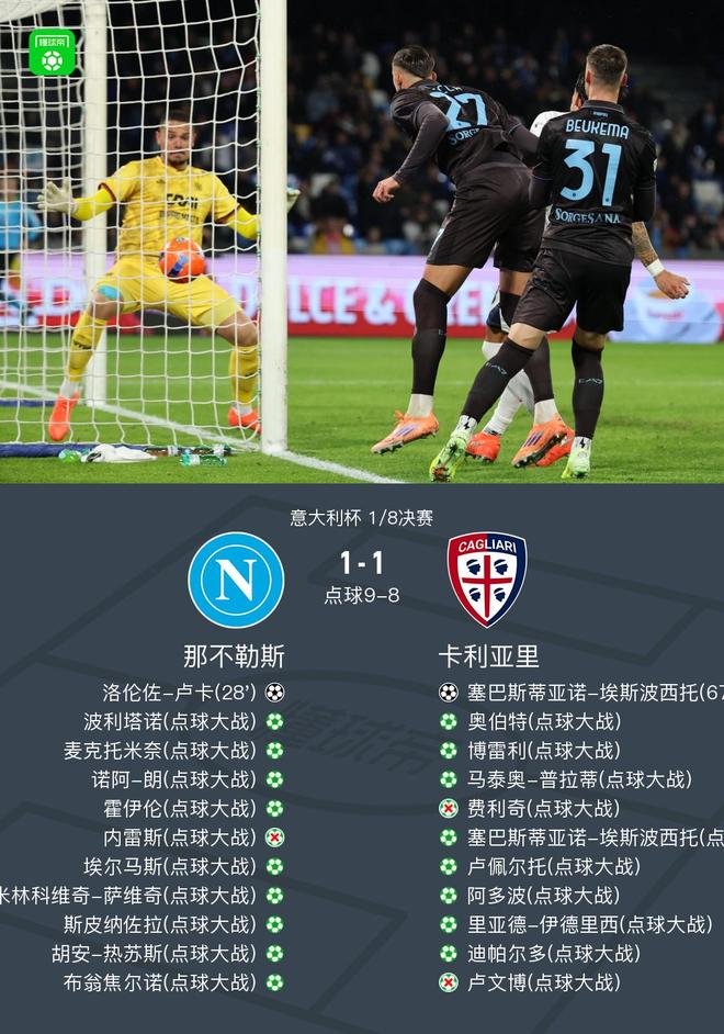 那不勒斯10-9点杀卡利亚里晋级意杯8强,费利奇、卢文博失点