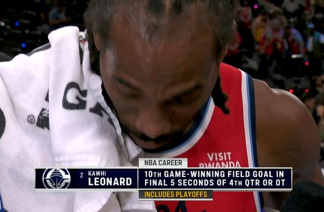 根据转播方显示,这是伦纳德生涯第10次在最后5秒内完成绝杀或准绝杀的制胜进球,从而帮助球队取胜。